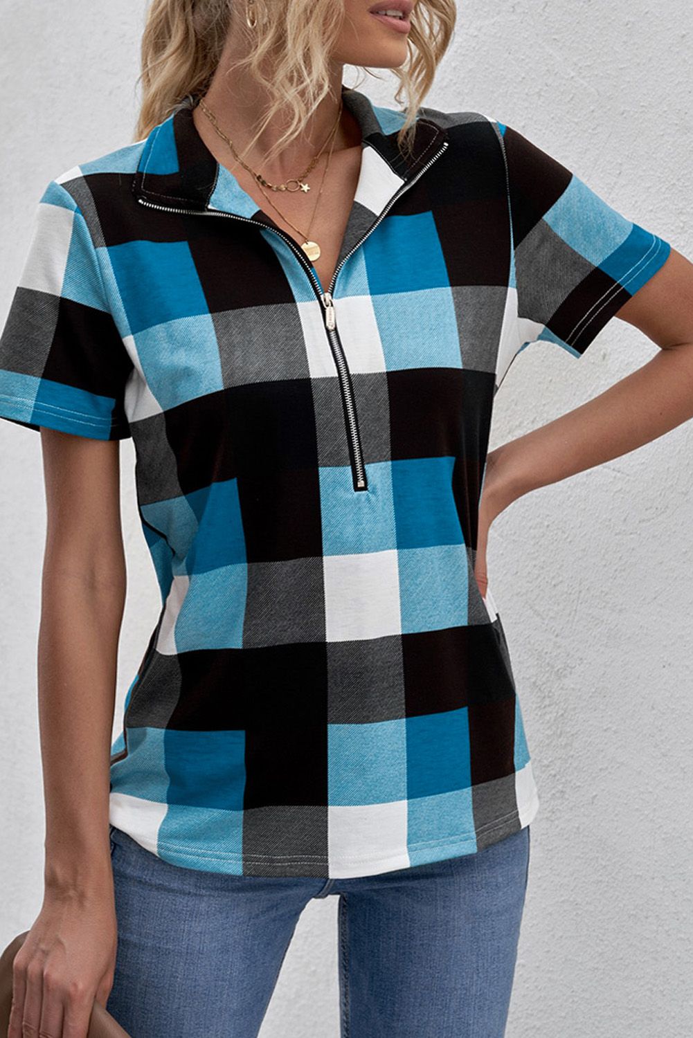 Blue Zipped V Neck Plaid Short Sleeve Blouse