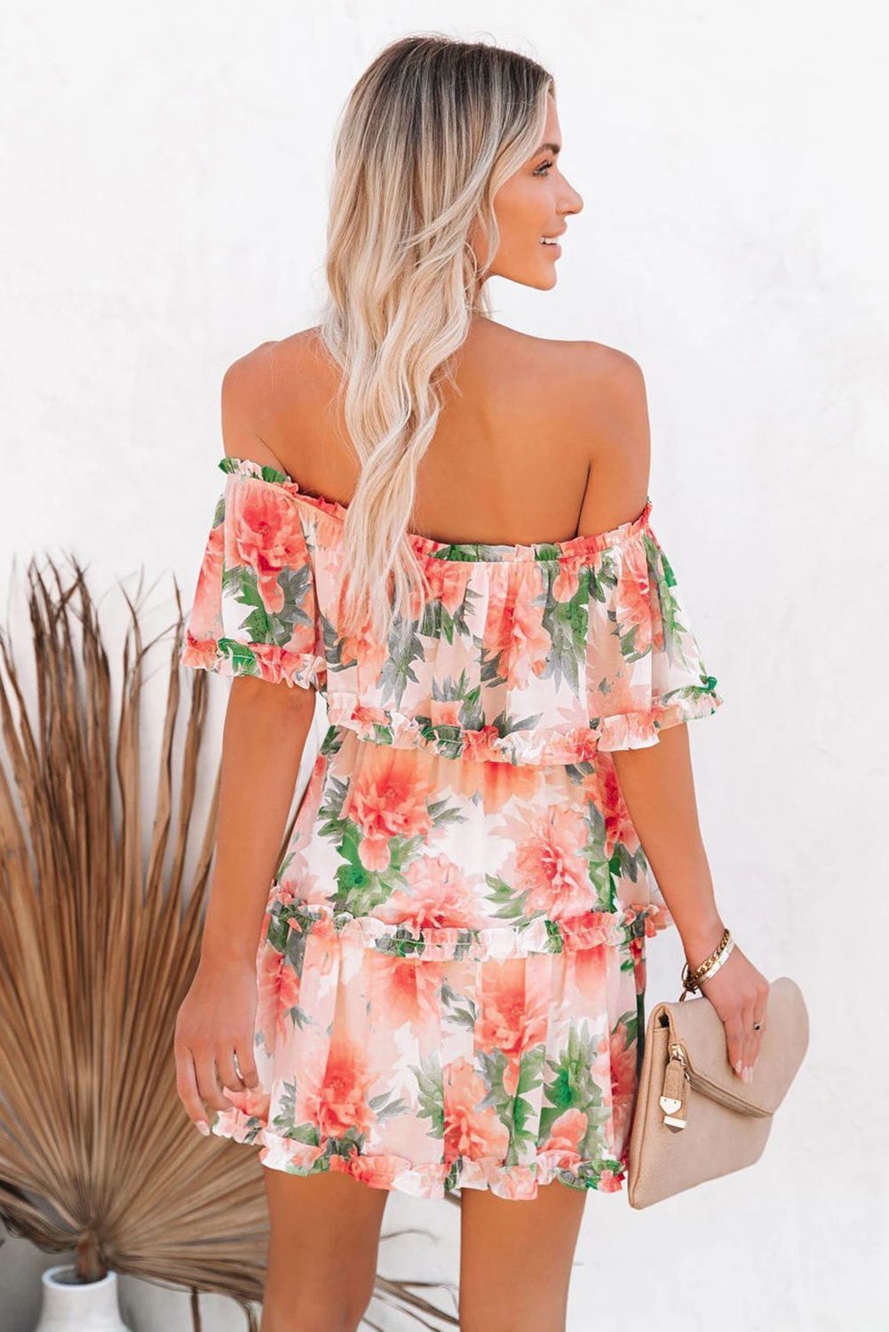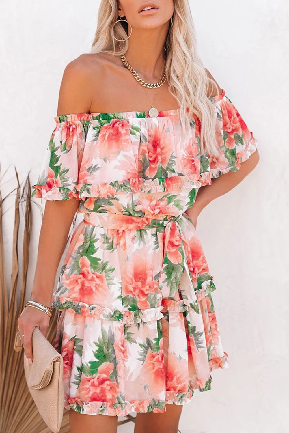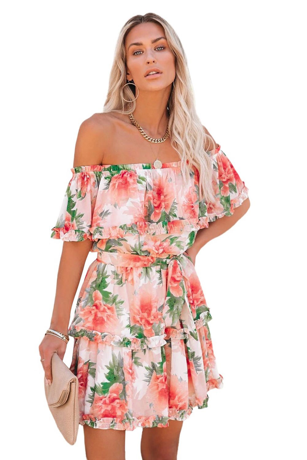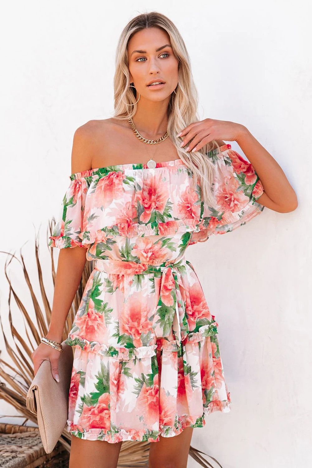 Short dress features floral with an off the shoulder neckline