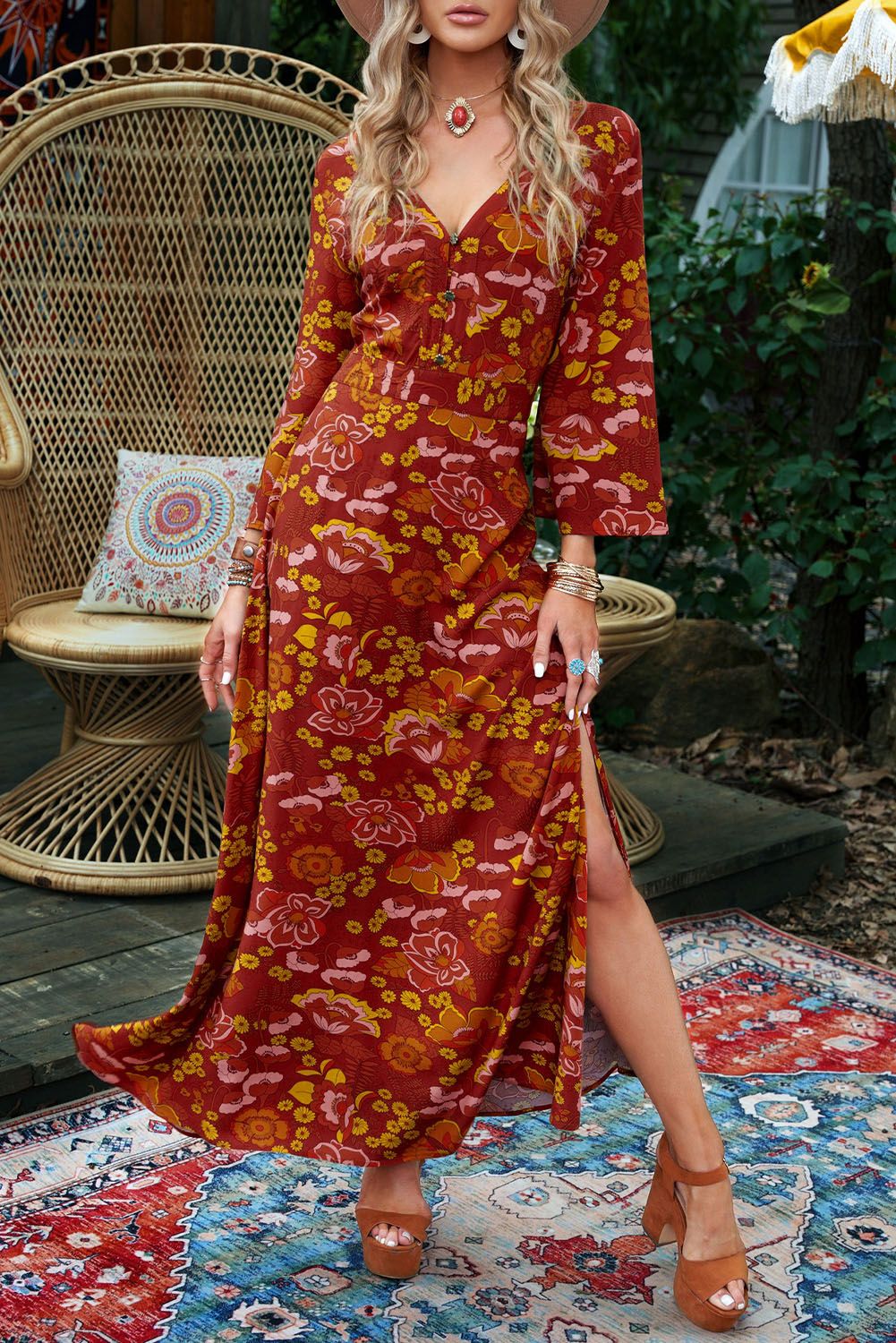 Floral Print Side Slit Buttons V Neck Maxi Dress