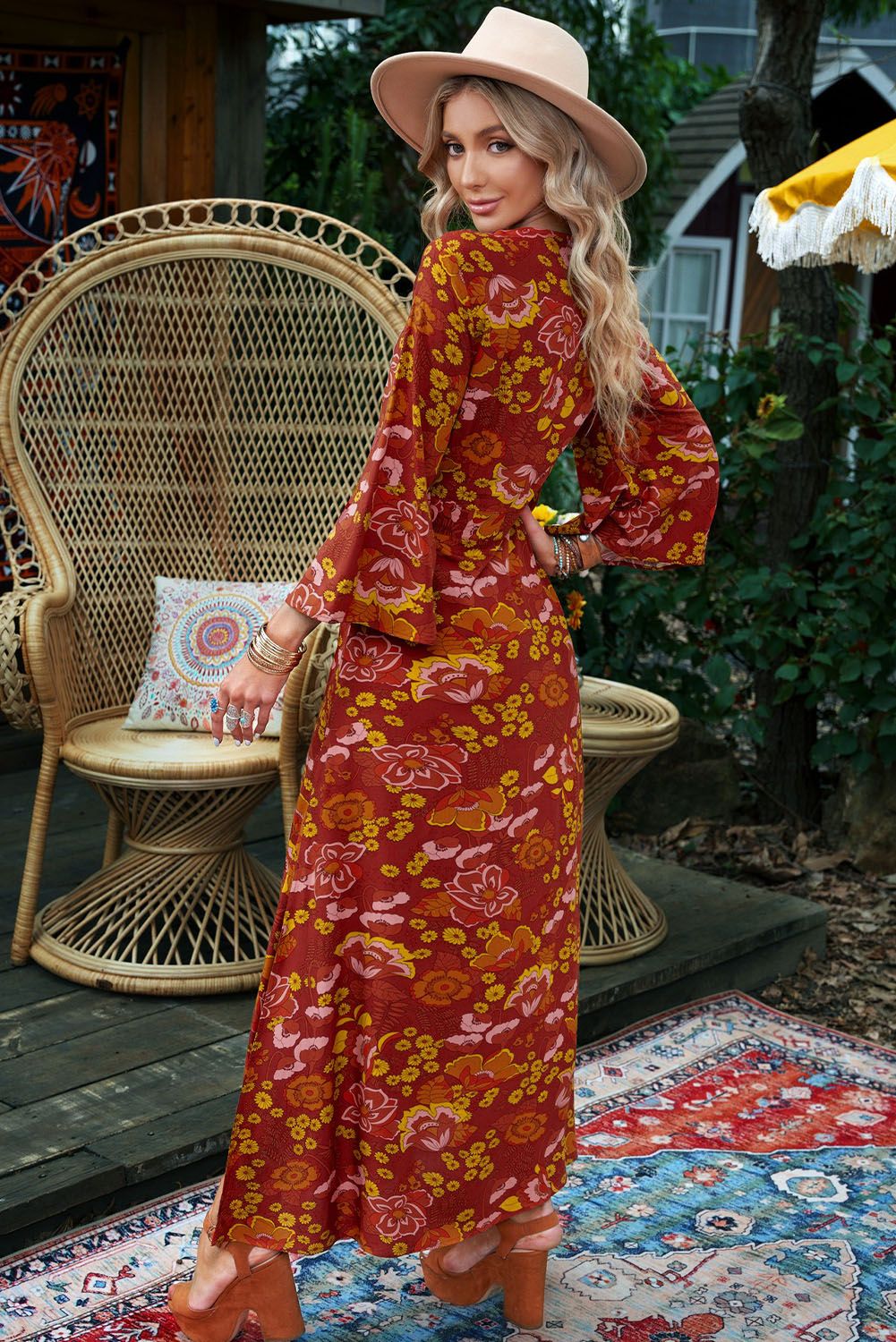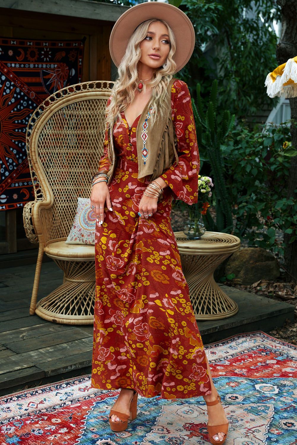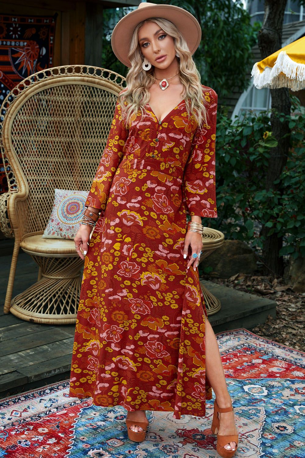 Floral maxi dress, elegant and fashionable, is great for women of most ages Button-up v neck shows off the wearer's neck line and collarbone With the side slit design makes the wearers sexier and chicer High-quality fabric, soft, lightweight and comfortable to wear Boho maxi dresses are suitable for party, beach, trip, date, etc
