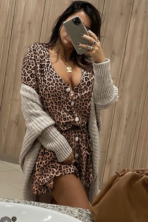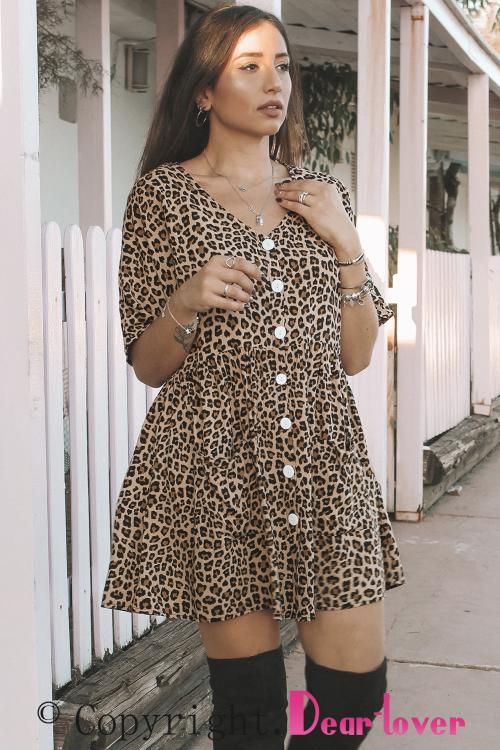 Leopard Print V Neck Button Half Sleeves Swing Dress