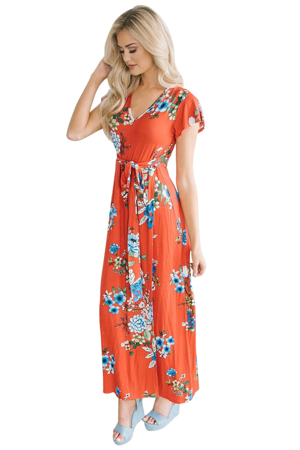 Navy Blue Floral Print Cap Sleeve Maxi Dress