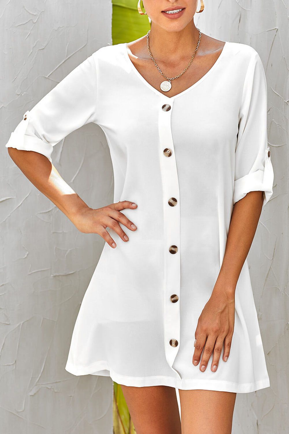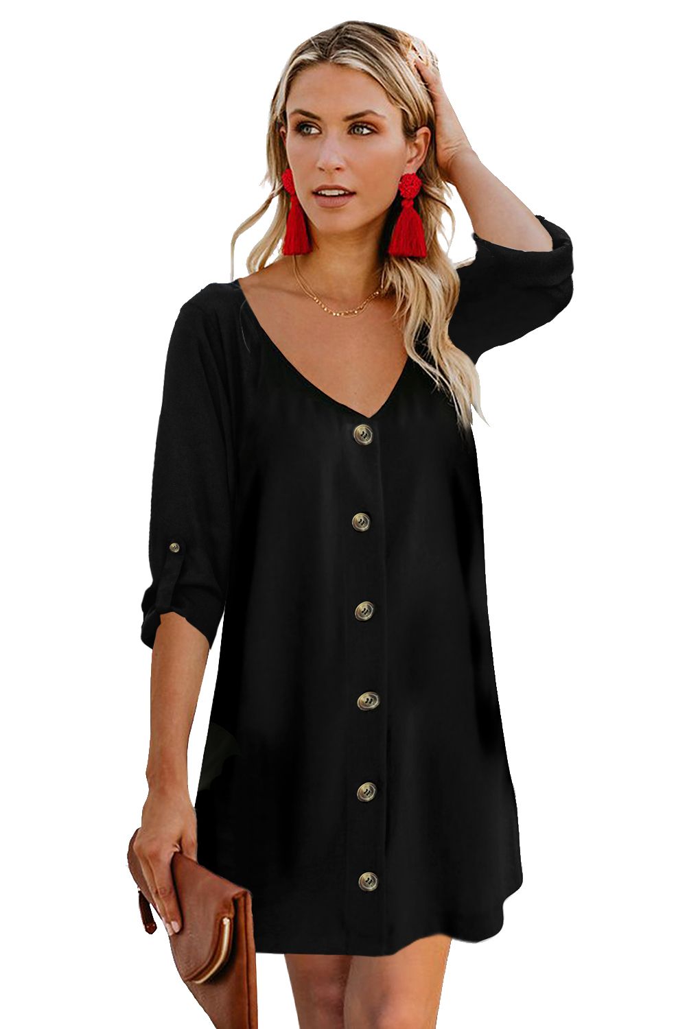 Black V Neck Button Front Roll up Tab Sleeve Dress