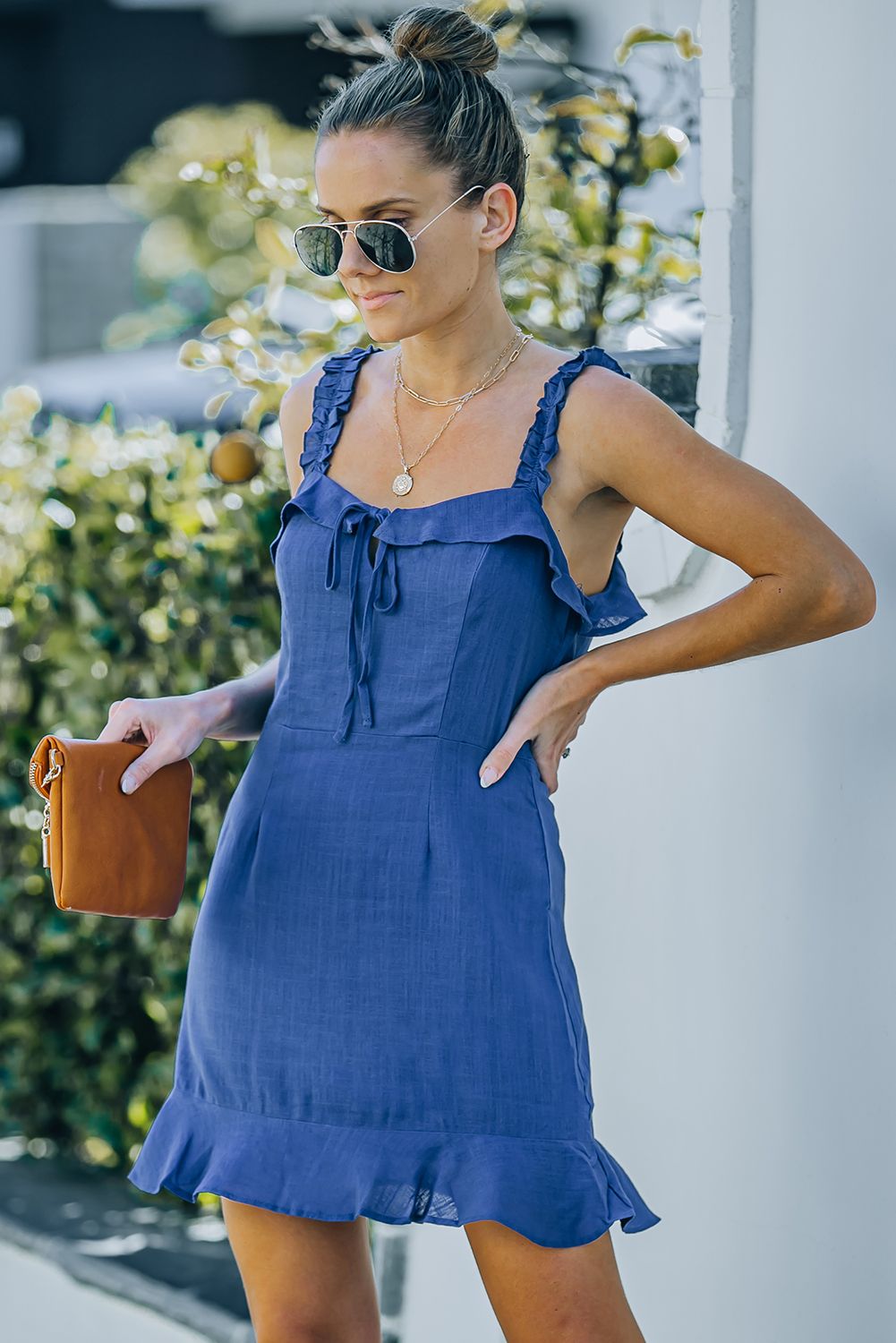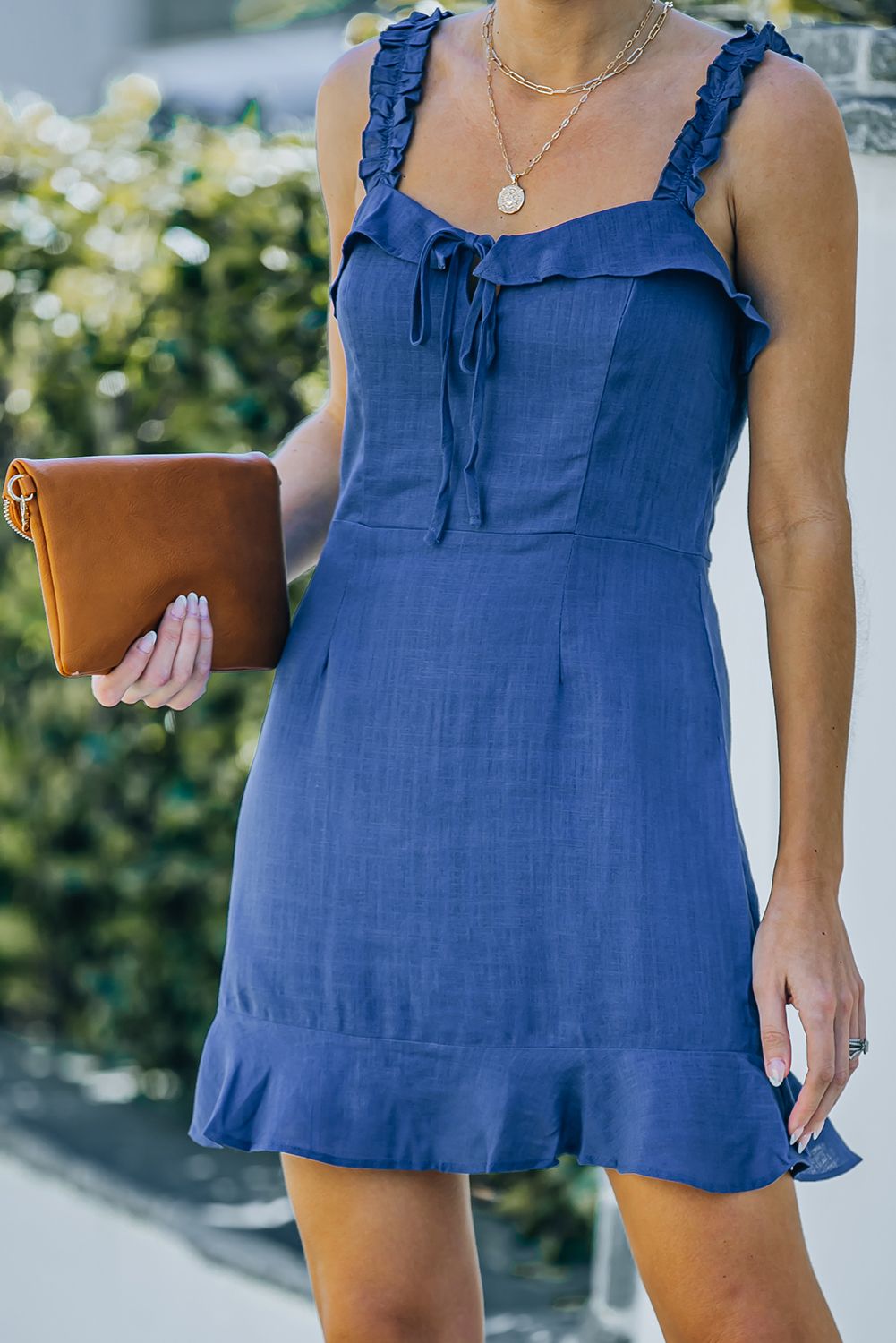 Blue Keyhole Tie Ruffled Hem Dress