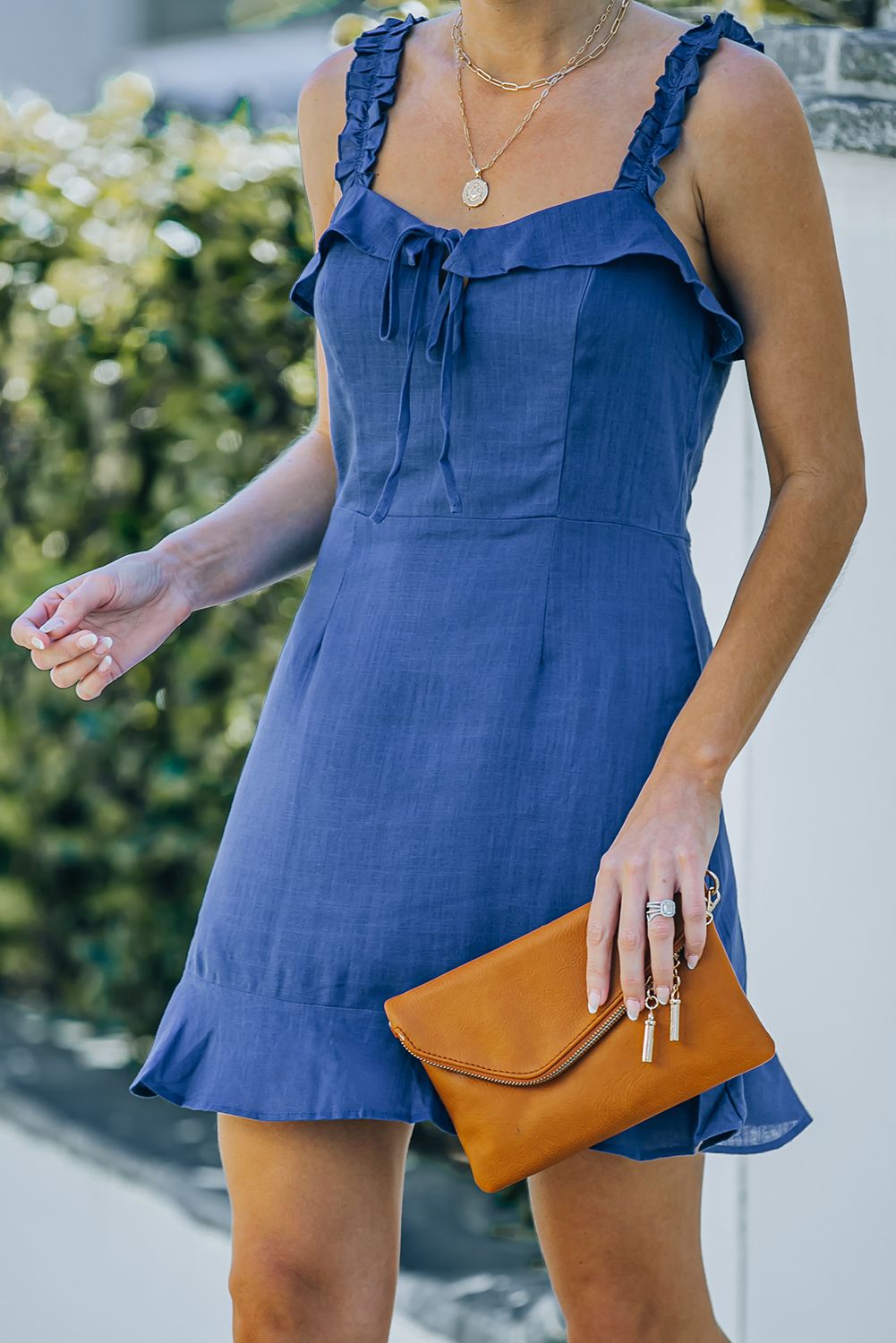 • This blue dress is sweet and sexy with ruffled trim and a revealing design
