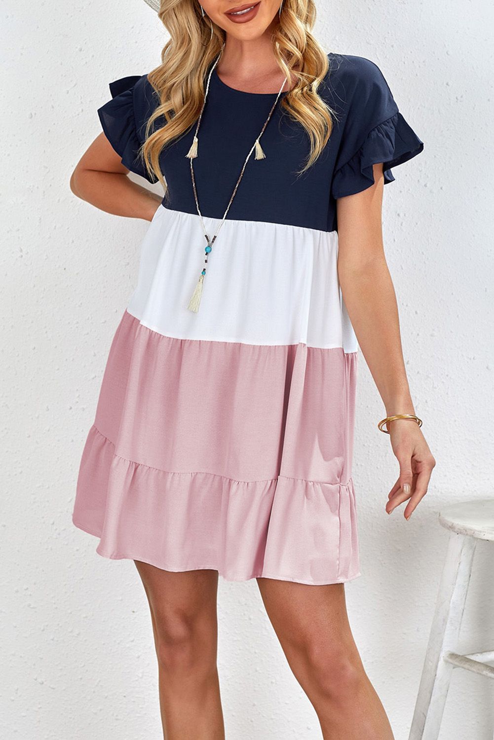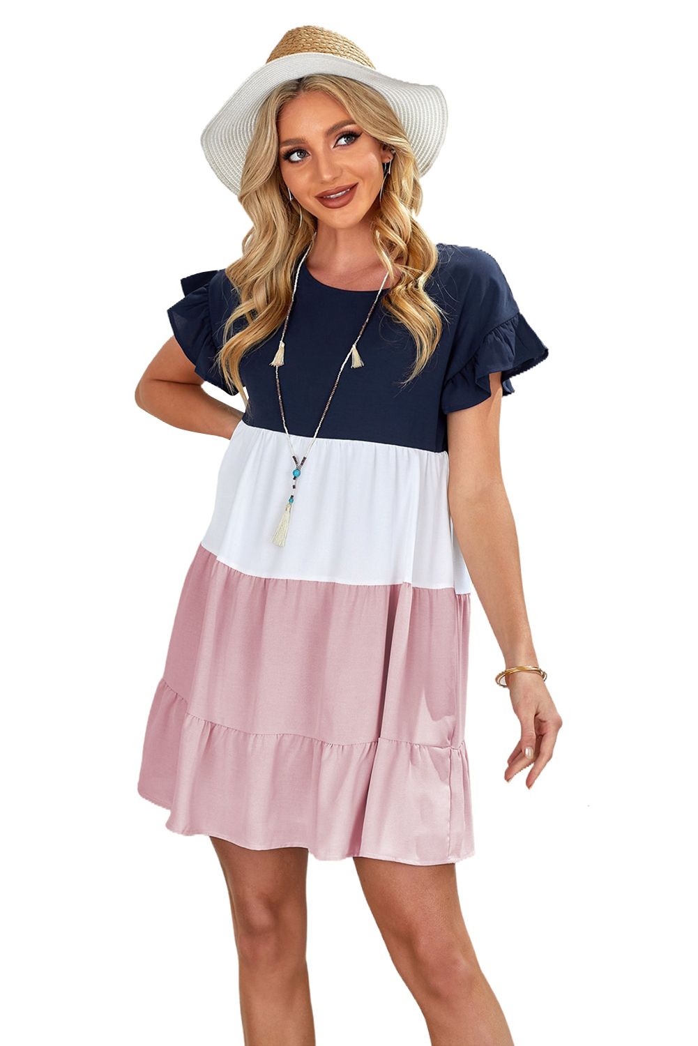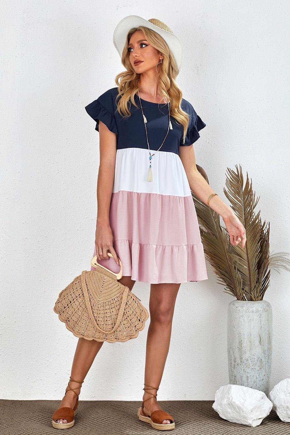 This colorblock tiered dress features ruffled cap sleeves and has a ruffle hemline