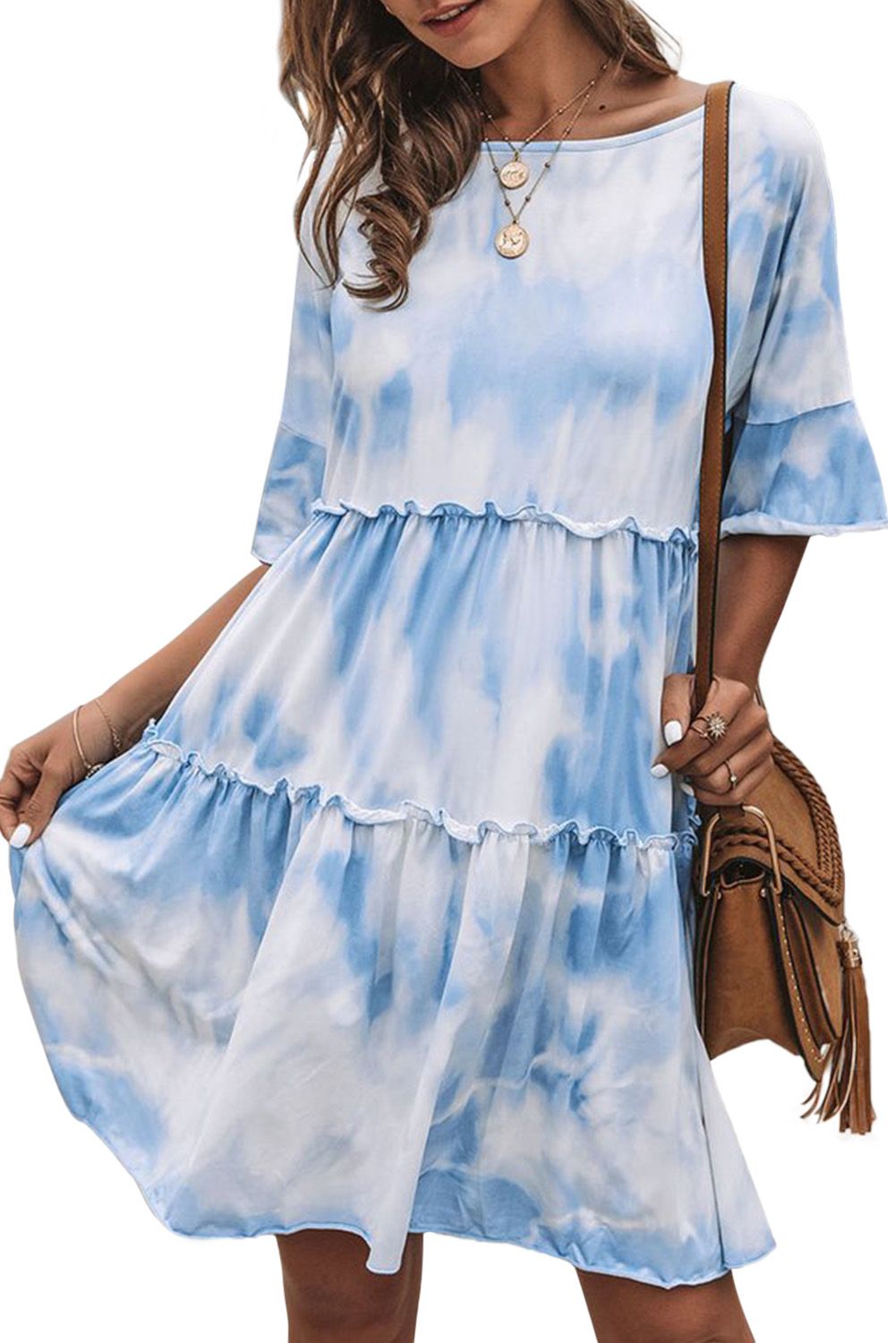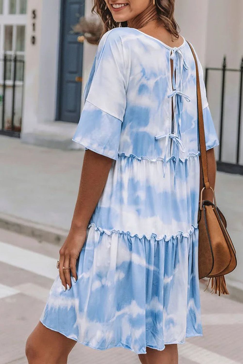 White Crew Neck Tie Dye Half Sleeve Dress