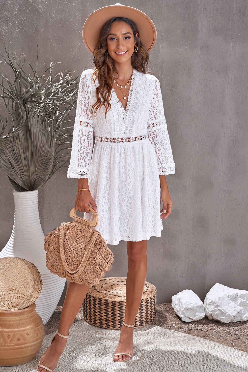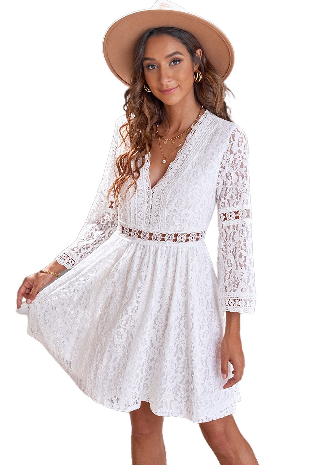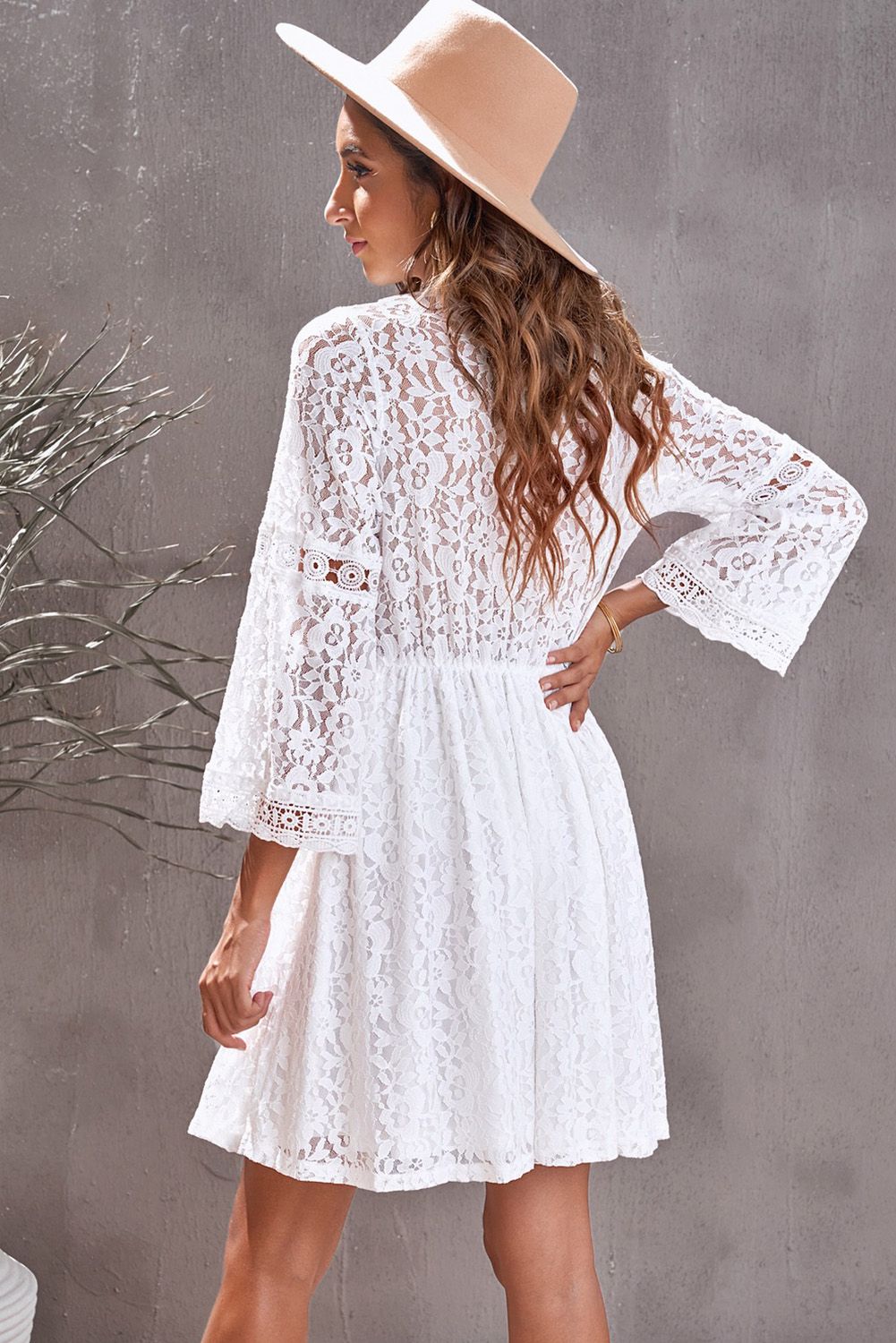 White Lace V Neck See-through Sleeve Mini Dress