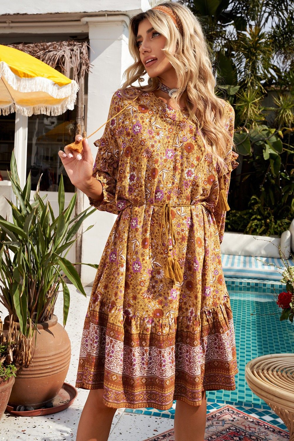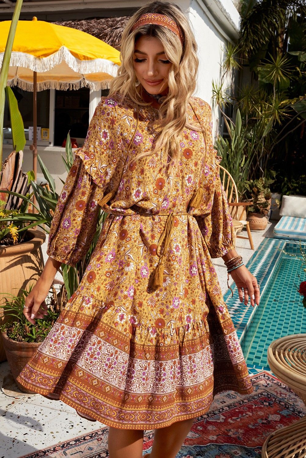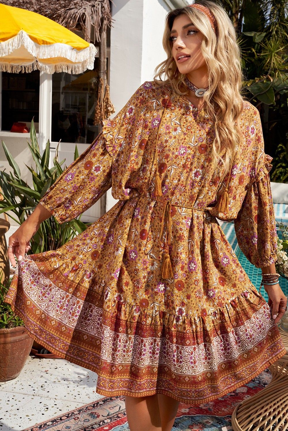 Orange Boho Floral Print Bishop Sleeve Mini Dress